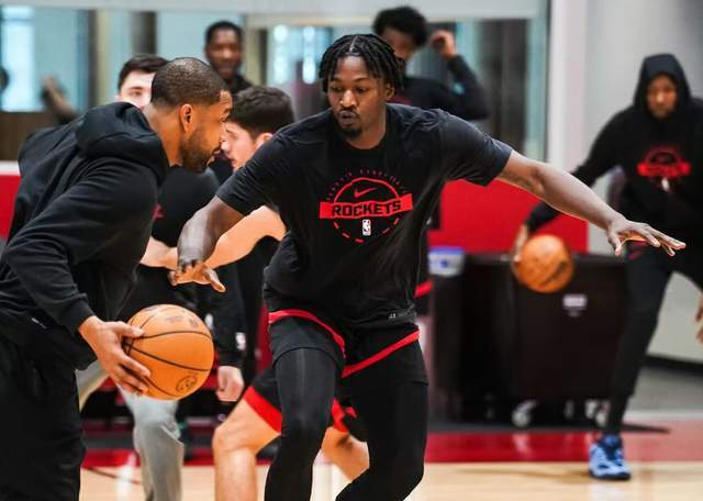 杜兰特本场手感一般,队友不能拉开空间,他只能是干拔中距离或者追身三分,效率非常低,其他球员的外线投射持续低迷。乌度卡排出的首发阵容,几乎放弃了三分,申京、阿门的外线投射并非稳定得分点,奥科吉和史密斯三分不稳。伊森受伤,谢泼德打不了首发,火箭队这套阵容,若没有交易,在季后赛当中走不远,完全看杜兰特单打。